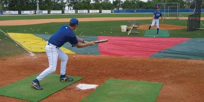 Athletic Connection Major League Bunt Zone Infield Protector/Trainer 15X24X54 Athletic Connections Bunt Zone Infield Protector/Trainer saves turf and teaches by visualization the correct placement of bunts for hits (yellow) or sacrifices (green). Avoid the red pitcher's triangle for bunting, hit-and-run, and pull-hitting. The highly spike-tolerant 9-oz. industrial vinyl-polyester mesh is treated with UV and mildew inhibitors. Heavy-duty construction includes fusion-welded seams with a full perimeter, double stitched, webbing-reinforced hem and 10 brass grommets installed. Low-profile ground stakes are included.