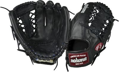 Nokona Bloodline Black Series 11.25" Baseball Glove Bloodline Black Series Bloodline is a top-of-the-line series featuring Nokonas proprietary Bloodline Leather. This unique tanning process gives our Bloodline Gloves the sturdiness and comfort top baseball players demand. Bloodline does require heavier break-in, but it is a strong, firm glove that will last. Made with a genuine shearling cuff. This series is offered in Bloodline Select Youth, as well as several Baseball sizes. Glove Specifications Pattern: 11.25" Pitcher/Infield model. Web: Modified Trap. Back: Open back. Hand: $size$.