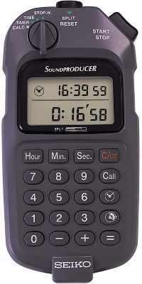 SEIKO S351 - Stopwatch and Multi Media Producer Specialty timer for audio and video production environments. Automatically calculates many common tasks such as inro, backtime etc. Hour, minutes, seconds displayed. Selectable between 12 & 24 hr. Time calculators: results stored for use in stopwatch and timer functions. Measures to 100hr with 1 sec. resolution. Counts up to or down from up to 99 hrs 59 min 59 sec. Countdown timer. Elapsed time. Silent operation. Split mode. Battery life indicator.