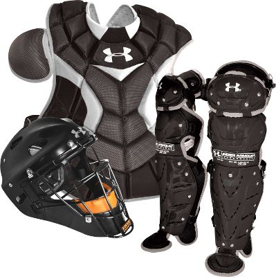 Under Armour Junior Ages 9 - 12 Black Catcher's Set Junior Catcher's Set includes: Chest Protector, Leg Guards and Headgear. Ages 9 - 12. Color: Black only. Buy the Set & Save $19.98! UACPJRP - Chest Protector: Pro level chest protector features memory foam designed to reduce rebound of blocked balls. New UltraCool construction has larger ventilation ports and slimmed side panels for lighter weight. Patented design presents flat surface to block balls. DeltaFlex harness for an exceptional fit. UALGJRP - Leg Guards: Pro level triple knee leg guards. Adjustable pads wrap around shins and extend ankle protection. DeltaFlex straps distribute pressure. Aegis microbe shield kills odor causing bacteria. UAHGYS - Helmet: Solid molded ABS plastic shell. Protects without sacrificing comfort. Patented I-Bar Vision face mask for increased strength
