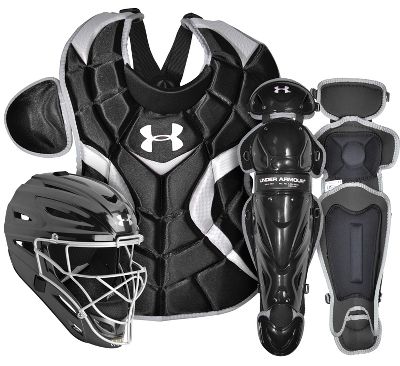 Under Armour Victory Series Senior Catcher's Set Protect Your House. Complete catcher's set designed for developing catchers. Under Armour technology, performance, and comfort at an affordable price. Includes chest protector, helmet and leg guards. Victory Series Helmet Hockey-style catchers helmet. Easily adjustable back plate and straps. Highly impact resistant ABS plastic shell deflects and absorbs hits from wild pitches, foul balls, and plays at the plate. I-Bar Vision steel cage face mask for strong protection and maximum range of vision. Moisture wicking, soft, and breathable inner liner. AEGIS Microbe Shield treatment prevents the growth of odor causing bacteria. Senior Size: 7" - 7 3/4''. Victory Series Chest Protector Complete over-the-shoulder protection behind the plate. Fully adjustable Velcro attached shoulder cap. Moldable plastic inserts in the throat, sternum, and sh
