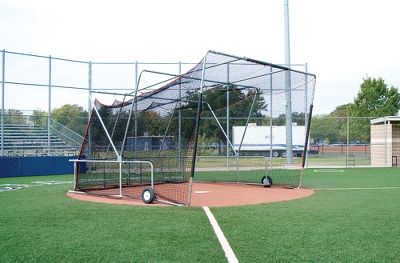 Diamond Sports Foldable, Portable Batting Cage Diamonds Foldable, Portable Batting Cage is constructed of 2-inch 14 gauge flo-coated galvanized steel with three 4 W x 16 D pneumatic tires for easy mobility. Theres also a 3.5 mm weather-treated EHT net with extra baffle net behind the batter and 18 of ricochet cushion. Interior Dimensions: 16.5 feet W x 16.5 feet D x 11 feet H Shipping Weight: 650 lbs