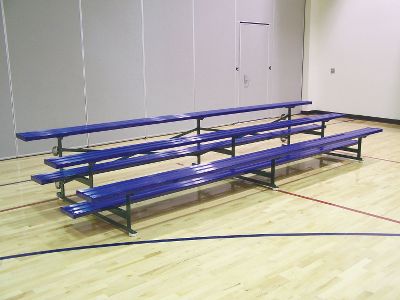 Jaypro 2 Row 28 Seat Tip N' Roll Bleachers The Tip N' Roll bleacher is perfect for indoor auxiliary seating requirements. This lightweight aluminum unit easily tips up on its casters for convenient storage. Our high grade swivel casters and rubber foot pads will not mar your floors. Seat planks are 2" x 10" anodized aluminum and the foot planks are 2" x 10" mill finished aluminum. These bleachers ship in 48 hours. Warning Tip N' Roll bleachers are suitable for indoor or outdoor use. These lightweight units are easily tipped up for rolling by any responsible adult. However, if tipped up outdoors, extreme caution should be taken in windy conditions. Multiple adults may be required to control the unit. Dimensions: 21' x 24" x 36" Weight: 240 lbs.