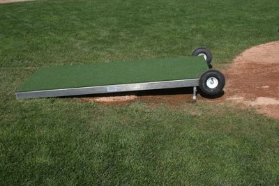 ProMounds Collegiate Pitching Platform Platform covered with spike-resistant artificial turf. Welded aluminum frame with inset plywood base. Equipped with wheels for easy transport. Adjusts from 6" - 10" for Youth and Adult usage. Designed for indoor or outdoor use. Weight: 155 lbs. (Bulk item - additional charges may apply upon delivery.) Dimensions: 7' x 3' x 6"/10"