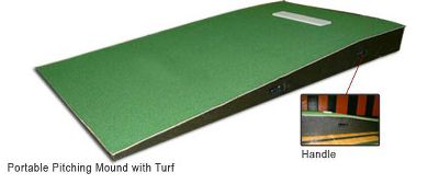 Trigon Practice Mound - 9' x 4' x 10" Mounds are made out of heavy-duty, high density foam and covered with skid-proof rubber armor. These pitching mounds include spike-resistant artificial turf (36 oz. Polypropylene Monofilament with a 5mm pad). Includes Transport Dolley for Maximum Mobility. Size: 9ft x 4ft x 10in