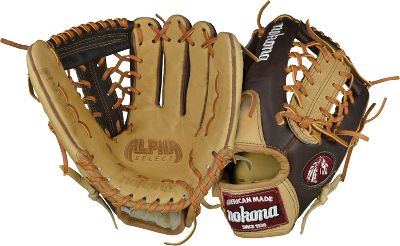 Nokona Alpha Select Series 11.25" Youth Baseball Glove Alpha Select Series This Youth performance series is made with Nokonas top-of-the-line leathers, Stampede and Buffalo, for ideal structure, weight, and very easy break-in. The combination of these two proprietary Nokona leathers makes these gloves ready for play right off the shelf without any need for steaming. The Alpha Select Youth series is offered in two versions for the most serious travel ball players: the S-100 for up to 10U and the S-200 for up to 14U. Glove Specifications Pattern: 11.25" Utility model. Web: Modified Trap. Back: Open back. Hand: $size$.